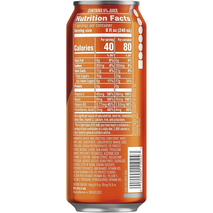 • Mtn Dew Kick start in energizing Orange Citrus. The perfect mix of Dew, real fruit juice and just the right amount of kick